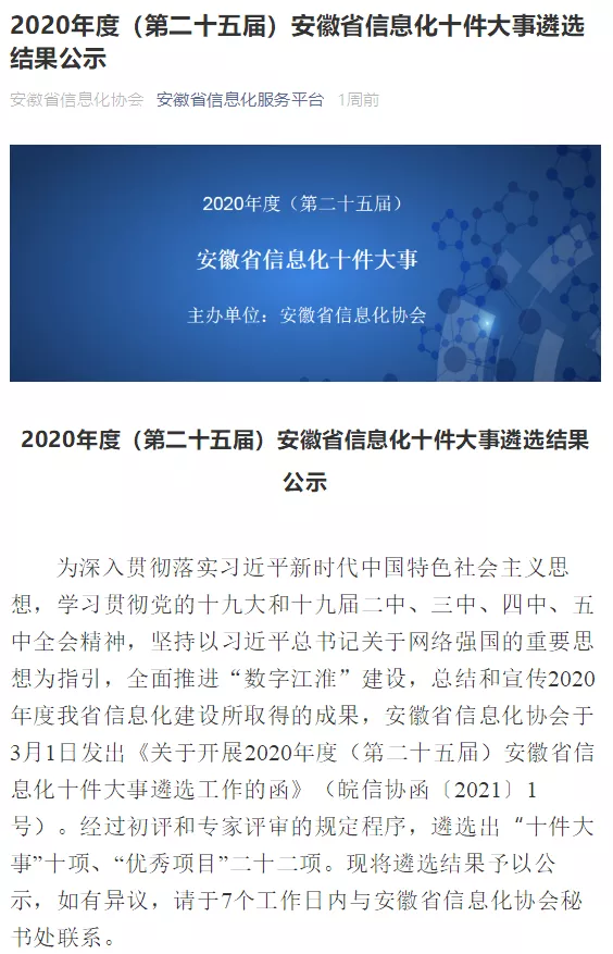近日,安徽省信息化协会公示了2020年度(第二十五届)安徽省信息化十件大事遴选结果,广东会信息申报的“芜湖市信息资源安全治理项目”经过初评和专家评审,成功入选2020年度安徽省信息化十件大事,标志着我公司信息化建设再上新台阶。