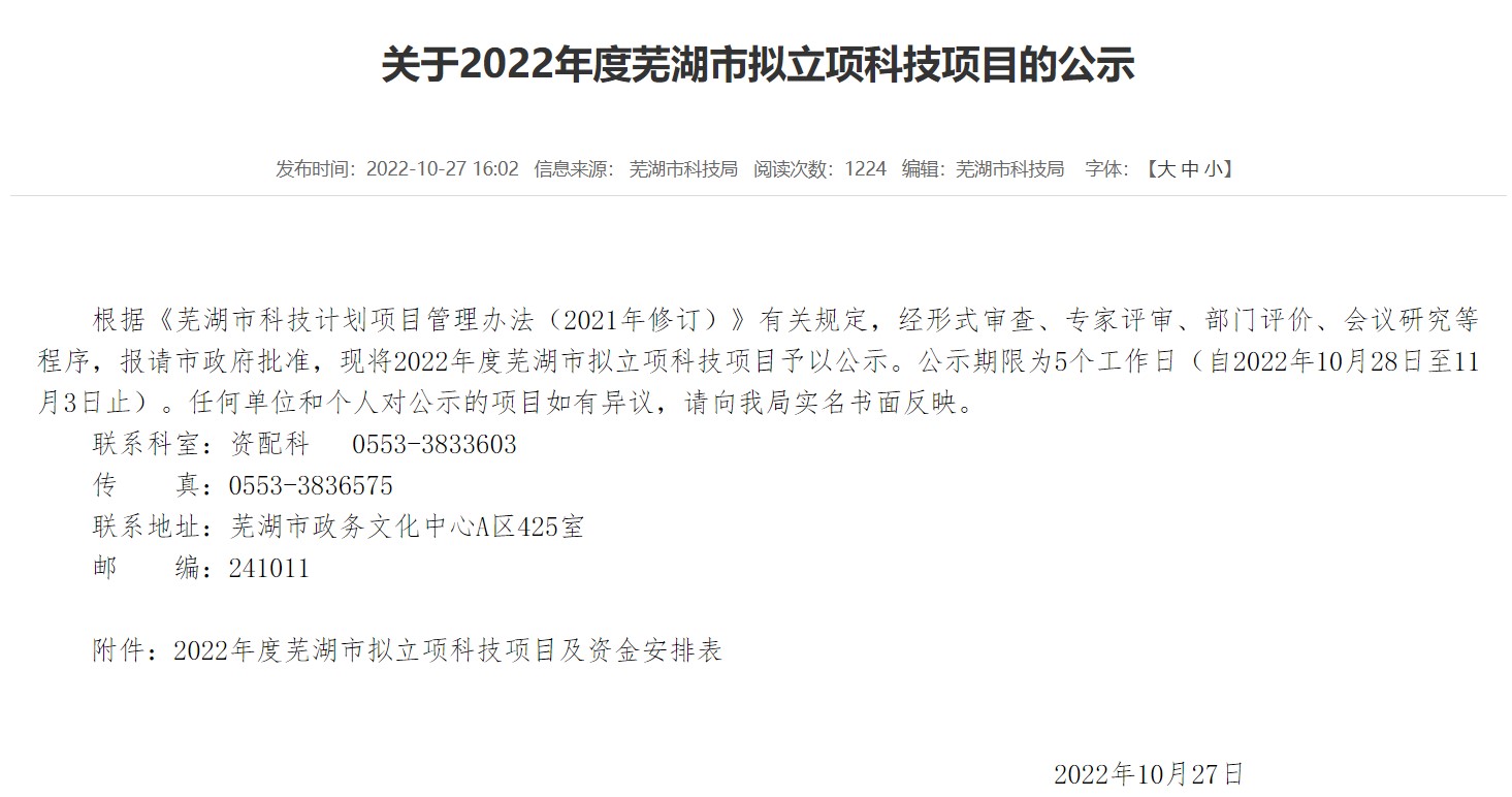 ? ? ? ? ?10月27日,芜湖市科学技术局公布了2022年度芜湖市拟立项科技项目名单。安徽广东会凭借基于信创环境下的运营感知管理平台项目榜上有名。