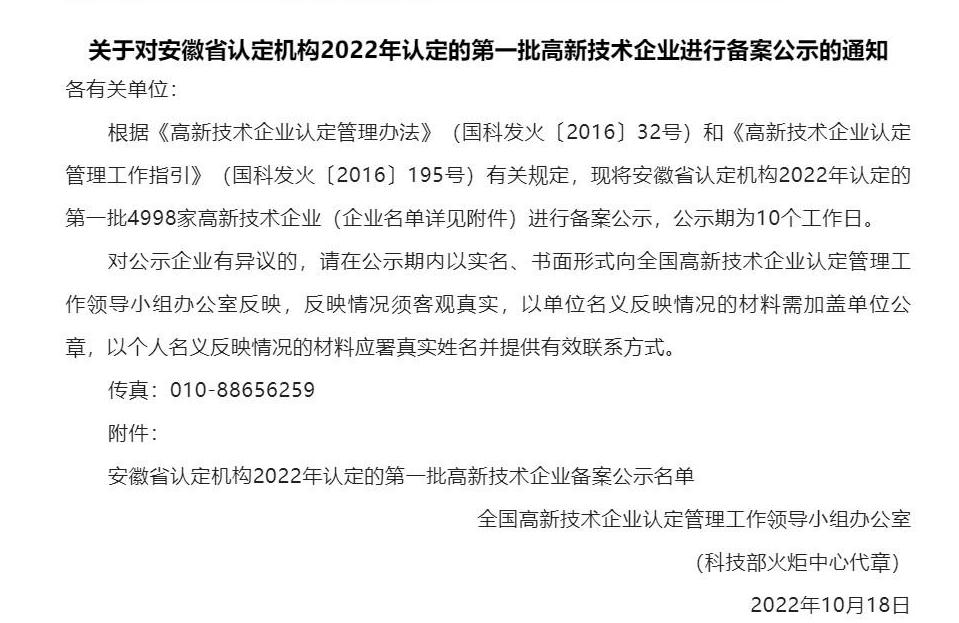 10月18日,安徽省认定机构对2022年认定的第一批高新技术企业进行了备案公示。安徽广东会信息继2016年,2019年,第三次被认定为