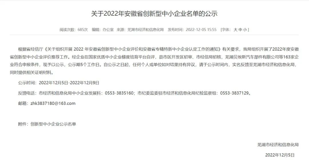 12月5日,芜湖市经信局公布了2022年安徽省创新型中小企业名单。安徽广东会成功通过审核,被认定为安徽省创新型中小企业!