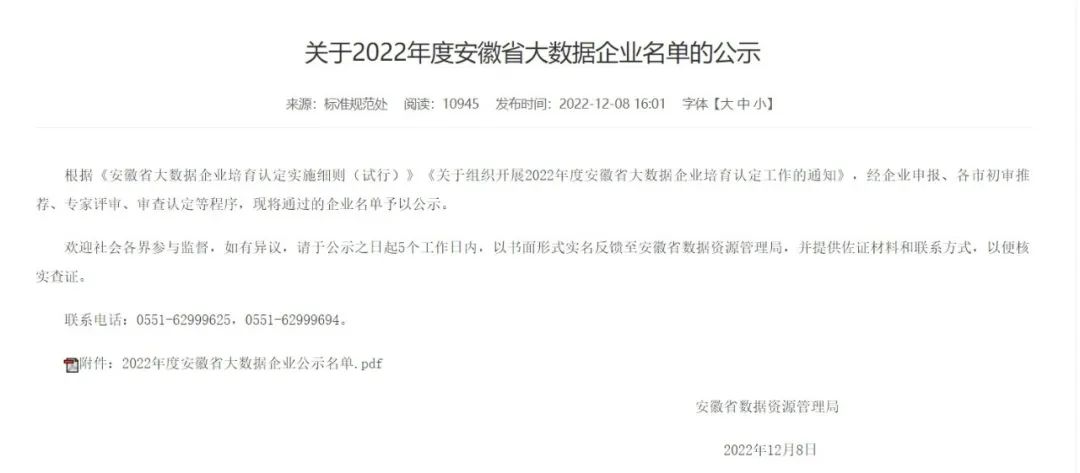 ? ? ? ?近日,?根据《安徽省大数据企业培育认定实施细则(试行)》的文件精神,经市级初审、专家评审等流程,安徽省数据资源管理局公布了《关于2022年度安徽省大数据企业名单的公示》,安徽广东会成功通过评审,经认定成为2022年度安徽省大数据企业!