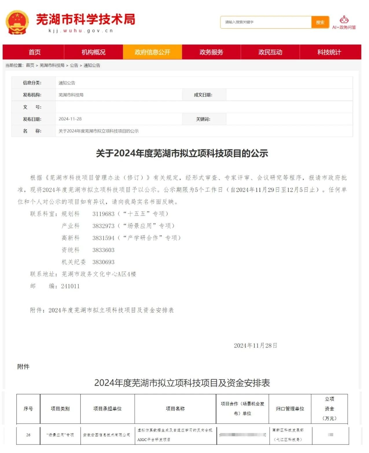 ? ? ? 2024年11月28日,安徽广东会信息技术有限公司凭借在仿真数据合成领域的深厚积累,申报的“虚拟仿真数据生成及自适应学习的反向合规AIGC平台研发项目”近日正式被纳入2024年度芜湖市科技局立项科技项目!此次成就不仅是对我司科研实力的认可,更是芜湖市科技局对促进本地科技创新环境和支持高新技术企业发展所作出的积极回应。